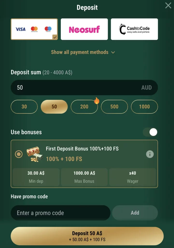 Casino Richard supports various secure payment methods for Australian players, including: Visa, Mastercard, Maestro, Neosurf, CashtoCode, MiFinity, Bitcoin Cash, Bitcoin, Dogecoin, Ethereum, Litecoin, USDT.